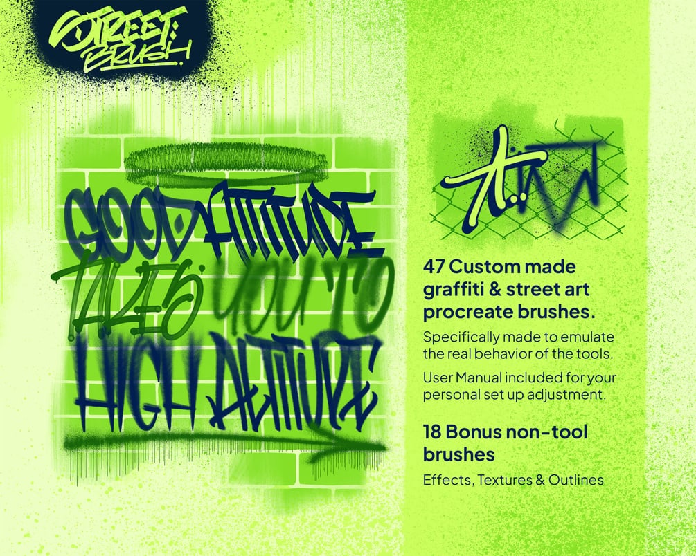 Street Brush package contains 65 custom made brushes for procreate. Inspired from graffiti and street art