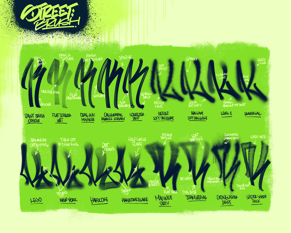 Street Brush package contains 65 custom made brushes for procreate. Inspired from graffiti and street art